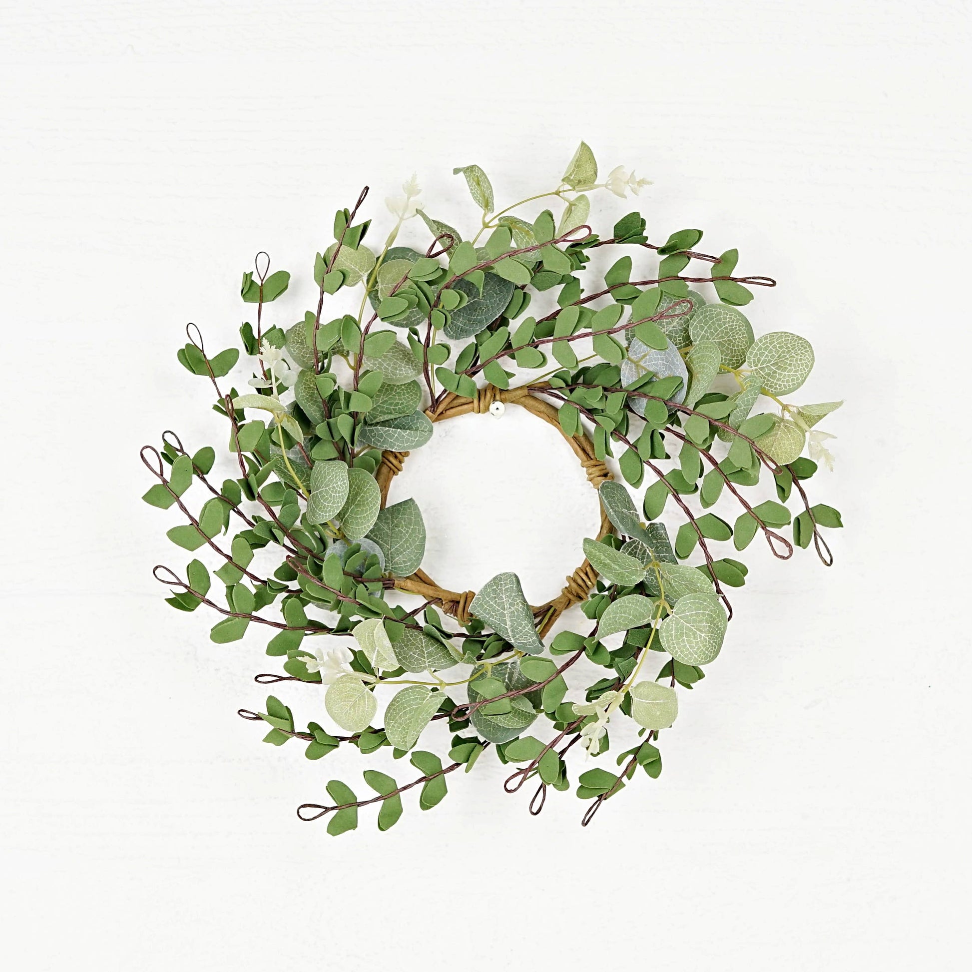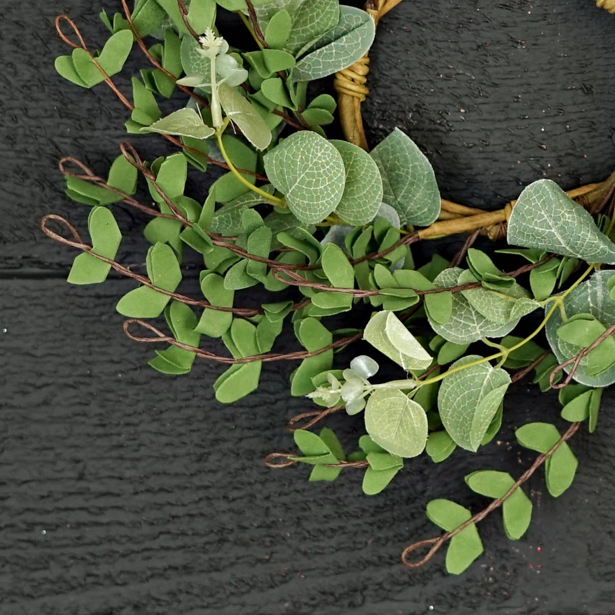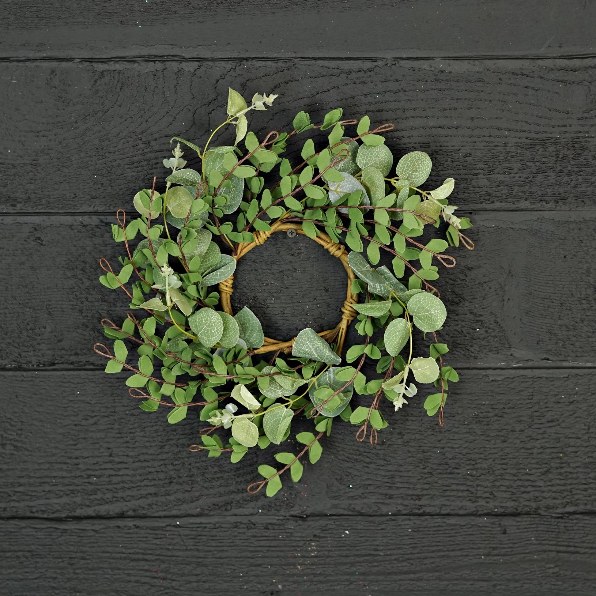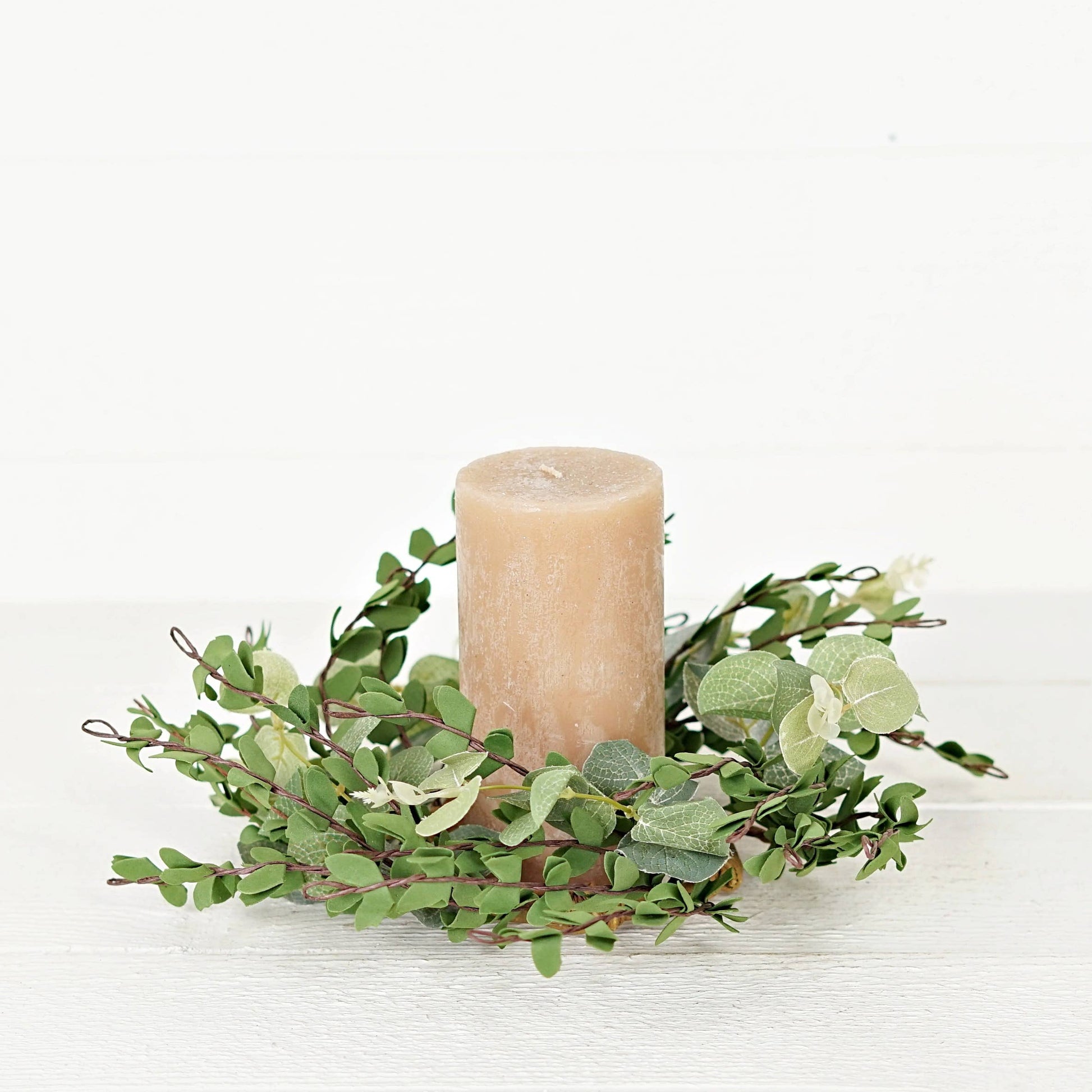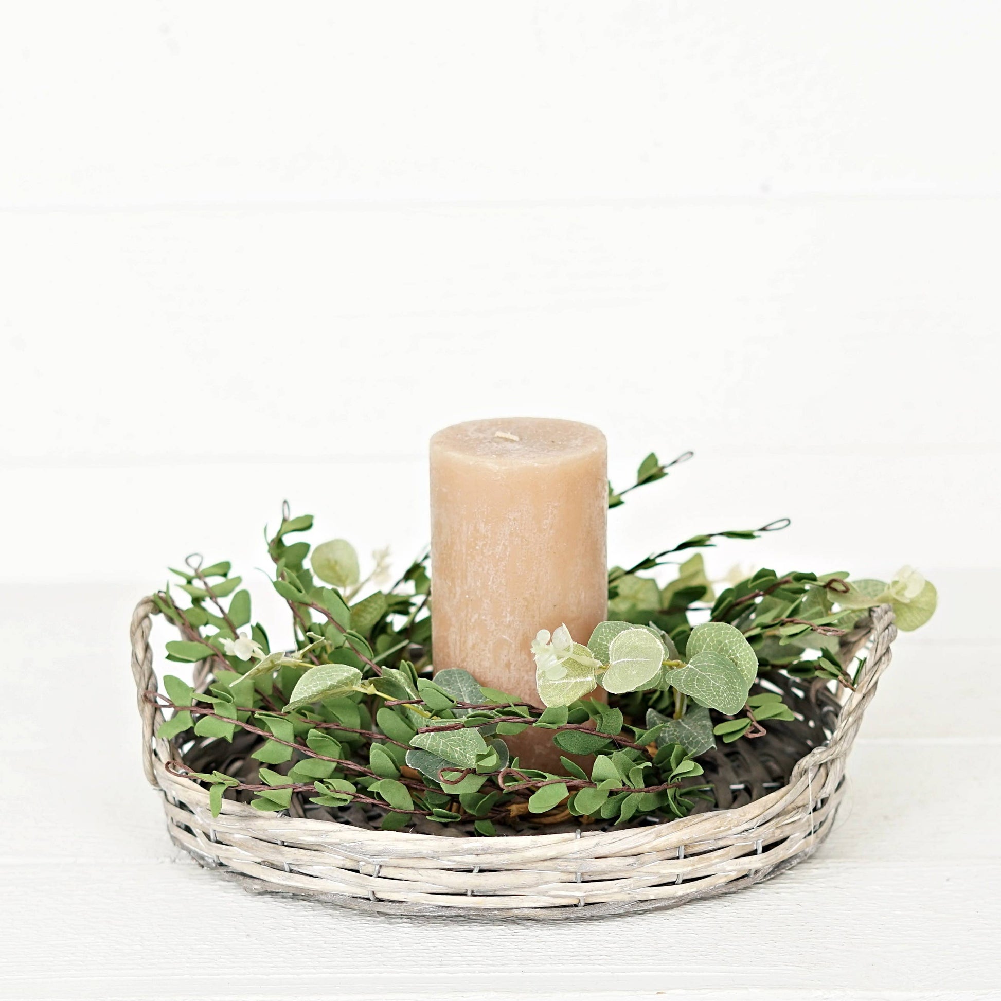 Create a cozy ambiance with our Mixed Eucalyptus candle ring—a charming blend of evergreen eucalyptus and delicate florals. Perfect for accenting trays, tucking behind picture frames, or showcasing your favorite candle, this wreath adds a refreshing natural touch to any space.