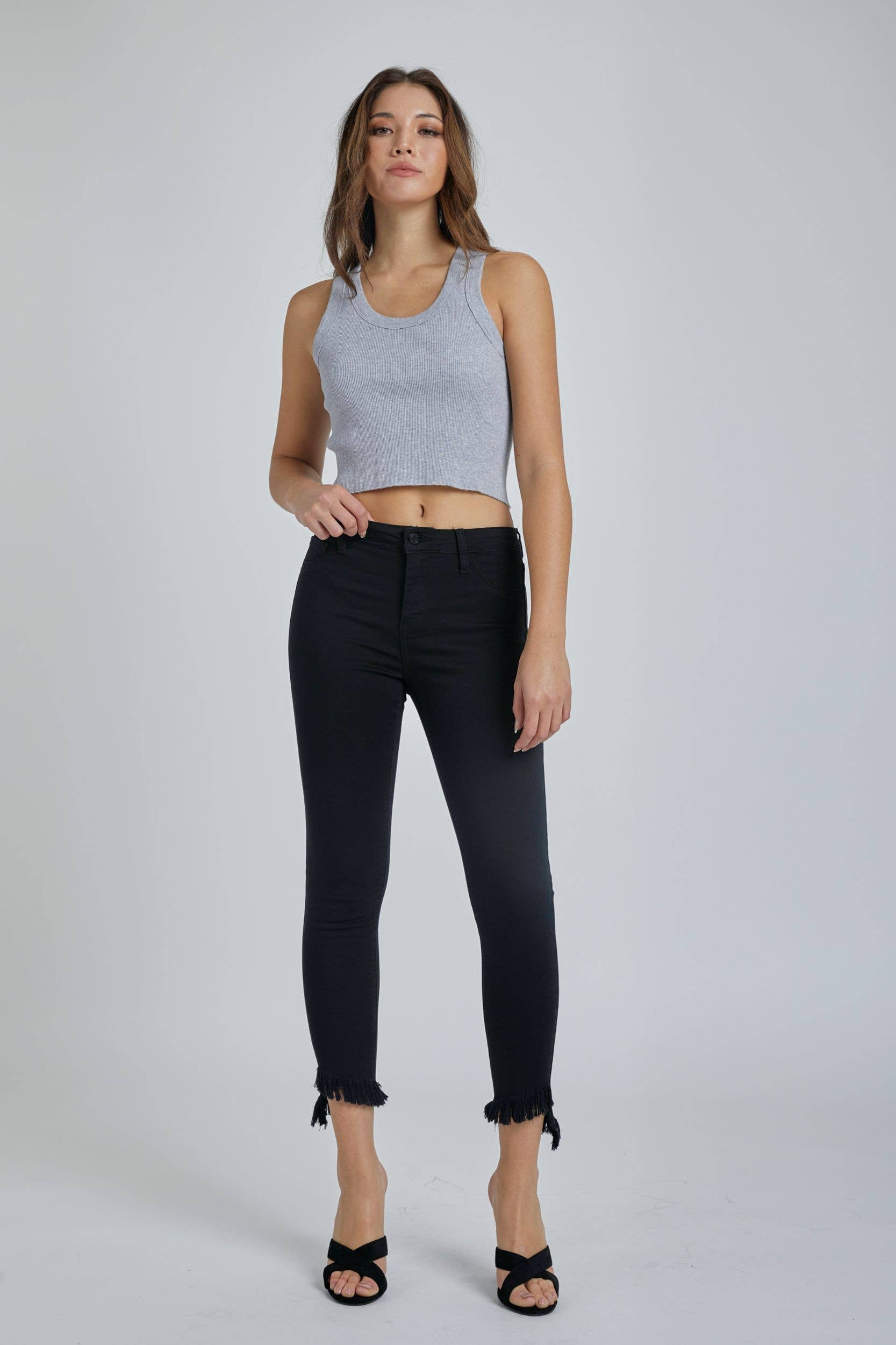 Set the trends with these mid-rise cropped black jeans that end in a frayed hem. Additionally equipped with five pockets, belt loops and a zip fly closure.
