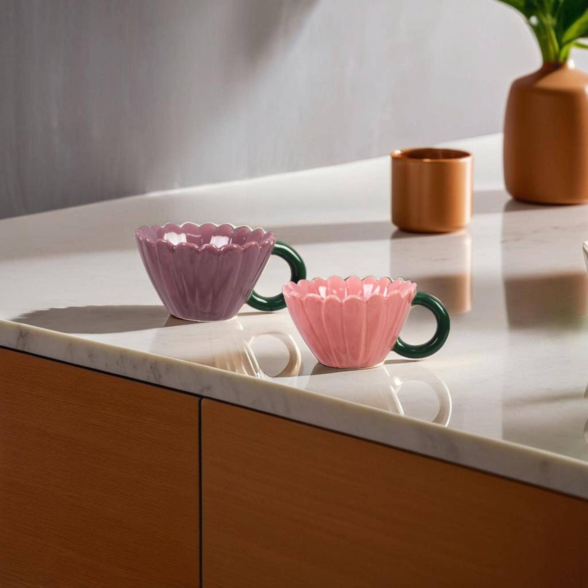 Enjoy your morning tea or coffee in style with these ceramic mugs, available in charming pink and purple floral designs. Ideal for adding a touch of elegance to your decor or giving as a thoughtful gift.