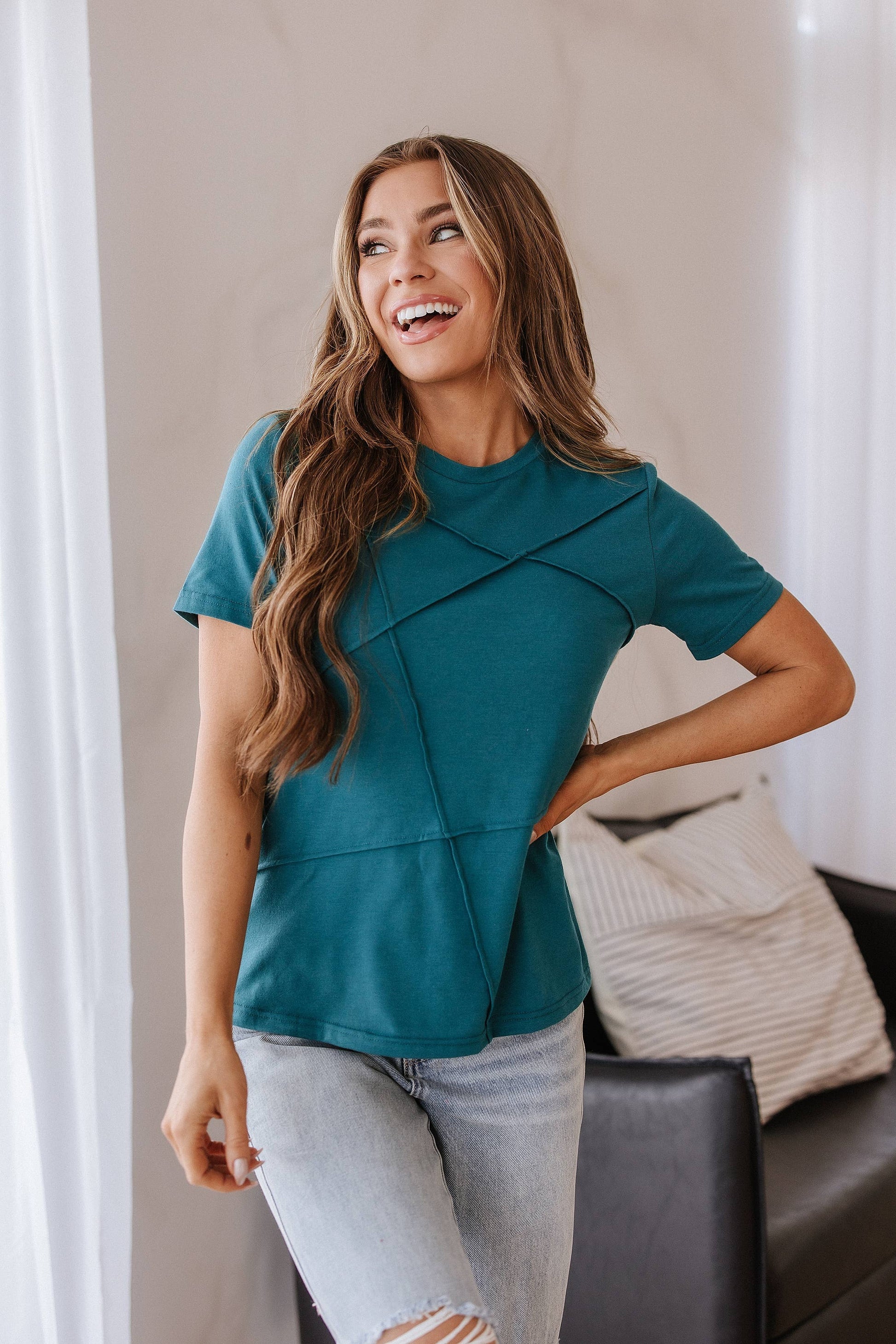 This Chevy Exposed Seam Top in the beautiful blue sapphire color is a must-have for any fan of classic cars! With its unique exposed seam design, this top is both stylish and durable. Incredibly soft and comfortable, perfect for layering or just on its own.