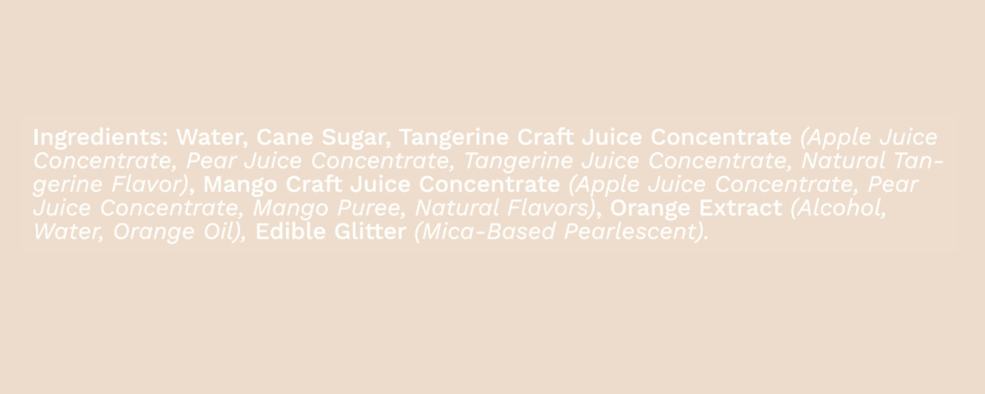 Get your sparkle on with our concentrated, glitter-infused Glitter Mimosa Mixer. It contains tangerine and mango in addition to FDA-approved edible glitter that is made from the mineral mica. There's absolutely zero micro-plastics or anything artificial.