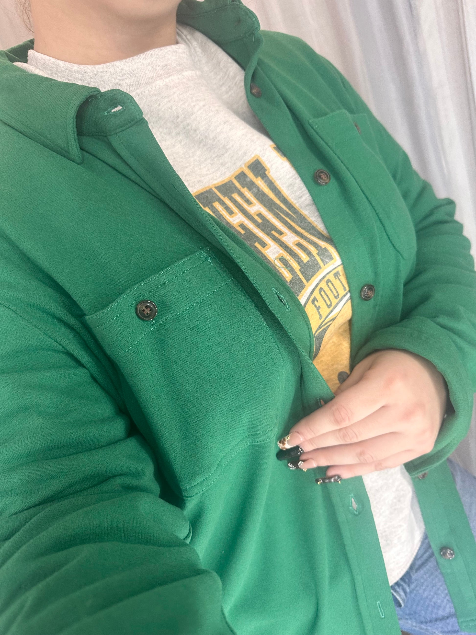 This green button-up shirt offers an incredibly soft feel and features a front button closure. Ideal for layering, it effortlessly elevates any outfit, whether you're aiming for a casual or polished look.