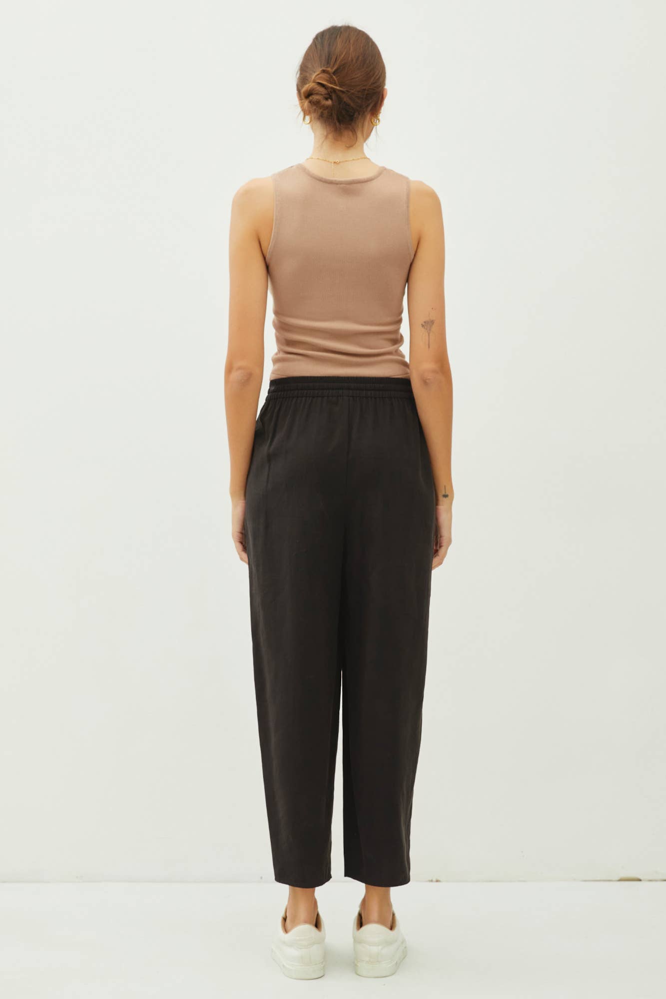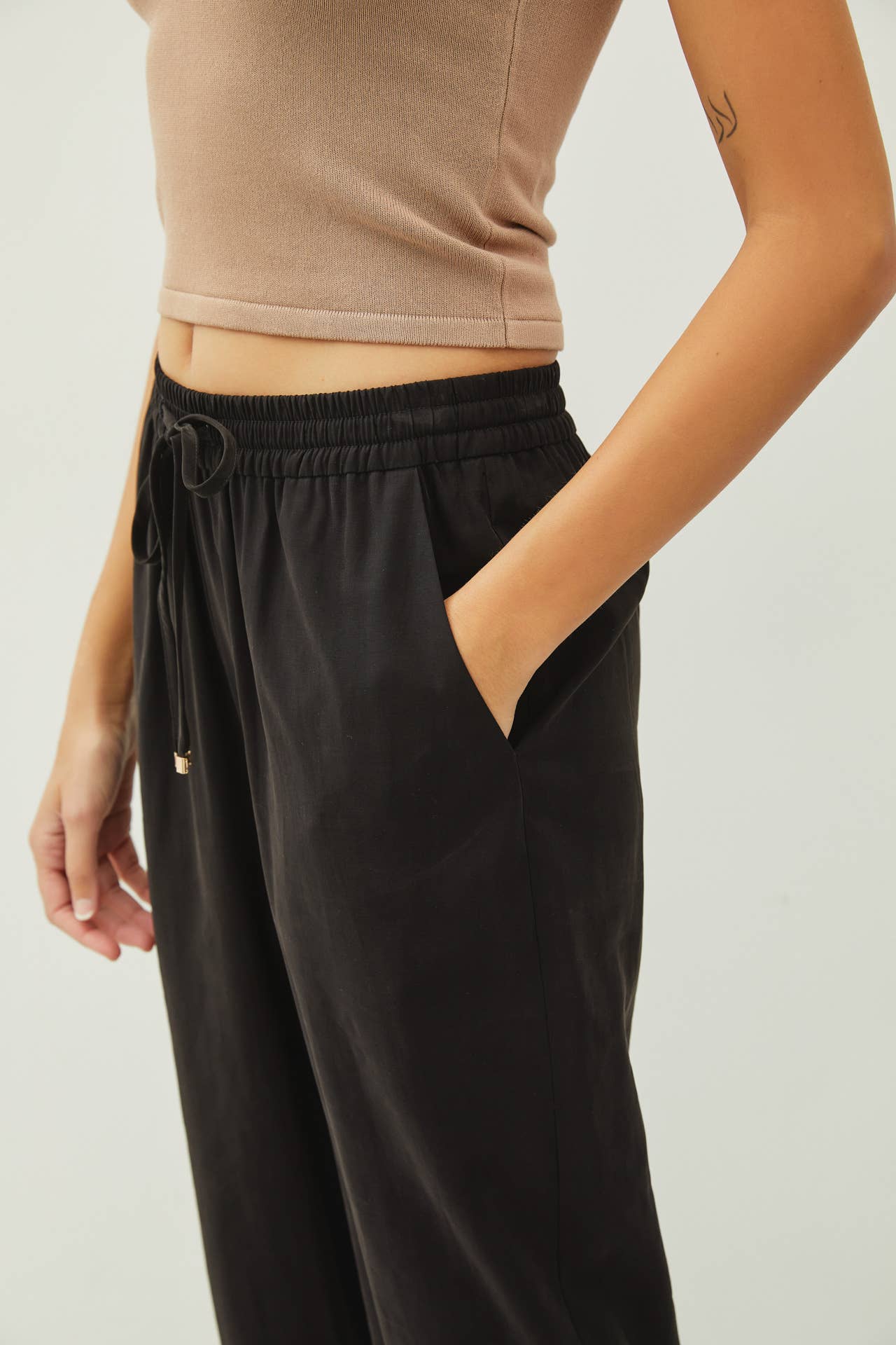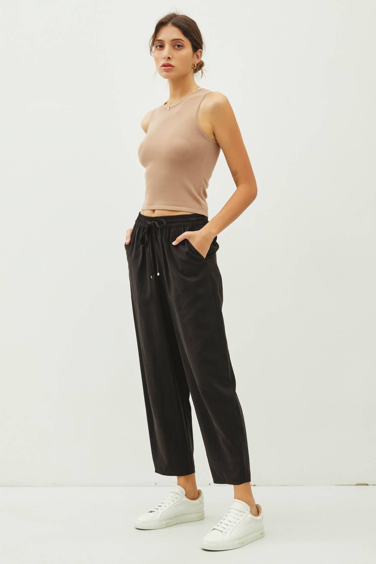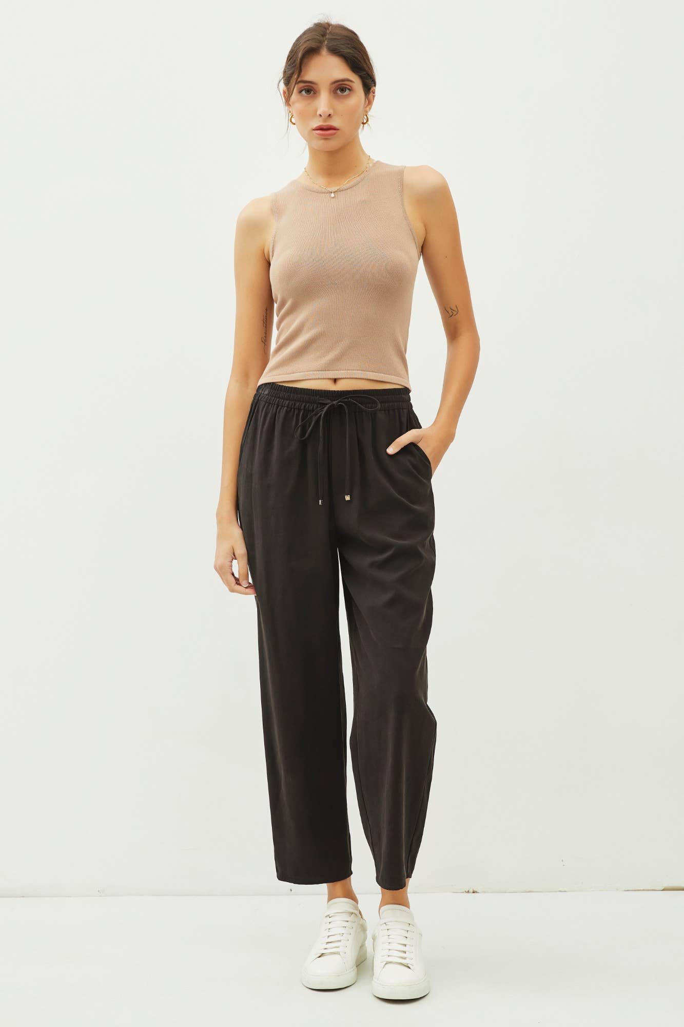 These black high-rise ankle pants offer a relaxed, slightly loose fit with a straight leg design. Featuring a soft, lightweight fabric, they include an elastic waistband with a drawstring for adjustable comfort. The cropped length and convenient pockets make them perfect for casual wear or to dress up.