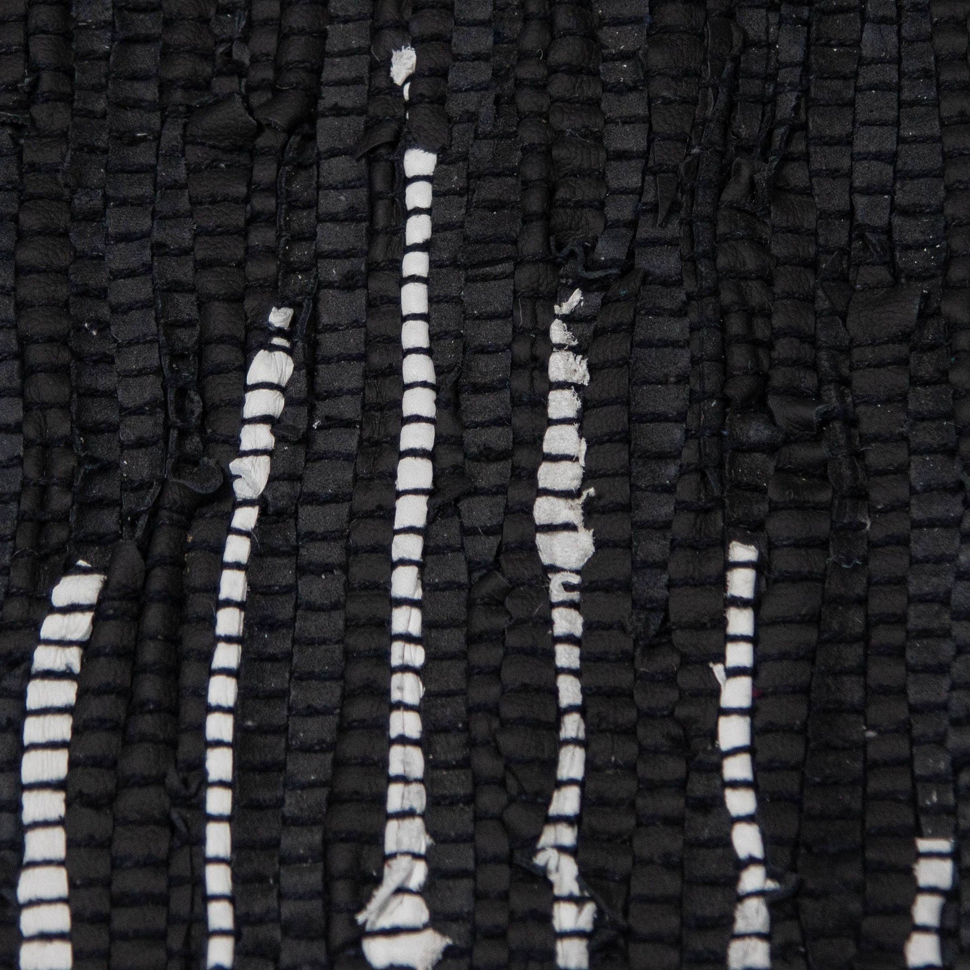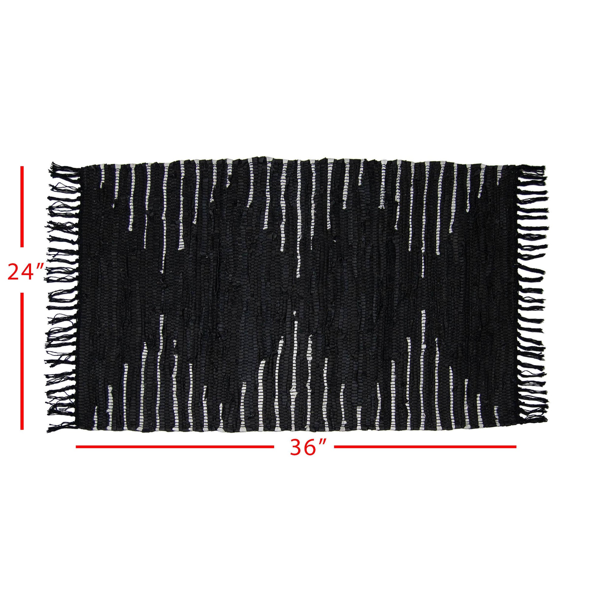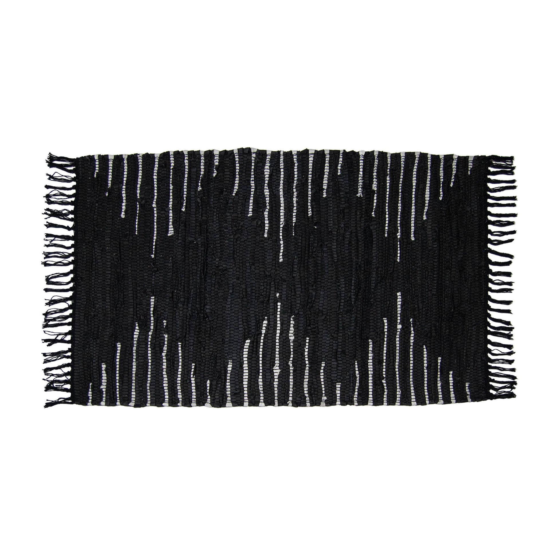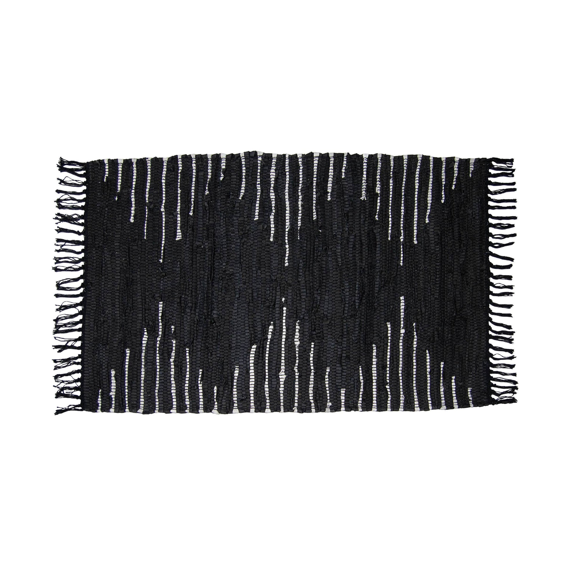 A durable, high-quality rug made from recycled leather and black and white cotton yarn. Modern, black triangles and white stripes create an optical diamond pattern that is finished with tassels on each end. The boho or modern farmhouse style aesthetic of this rug is perfect for any doorway.