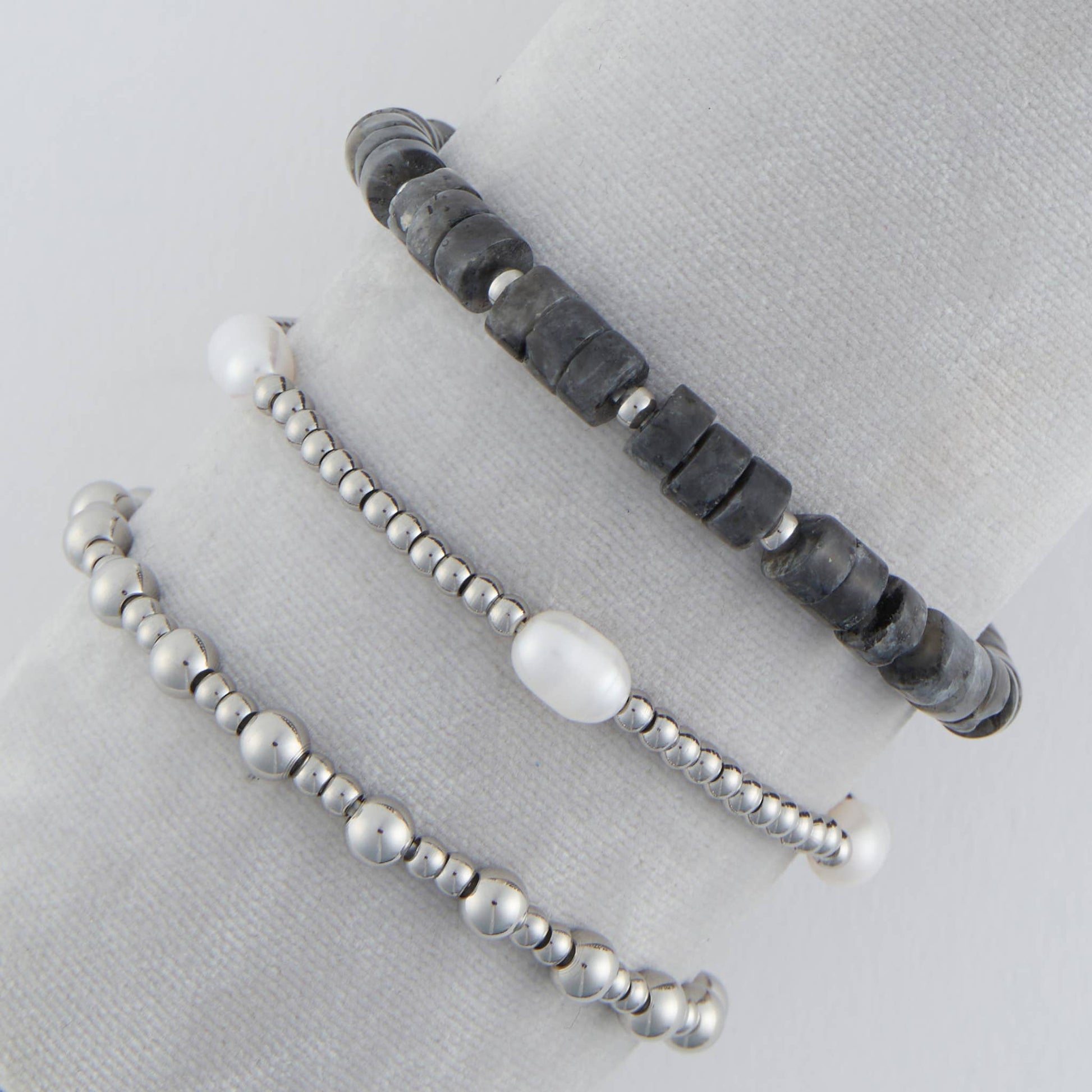 Narelle Waterproof Mixed Bead & Pearl Bracelet Set Natural elegance meets modern edge. This 3-piece stack features a stunning blend of smooth gold ball beads, luminous freshwater pearls, and soft-toned genuine stone accents for an organic yet polished look. Available in radiant 18K gold or polished stainless steel, each bracelet is stretch-fit and finished with our signature waterproof, tarnish-resistant PVD coating. A thoughtfully layered trio that brings together texture, tone, and timeless shine.