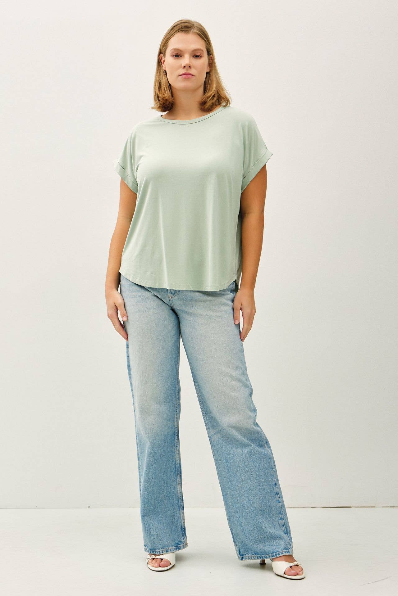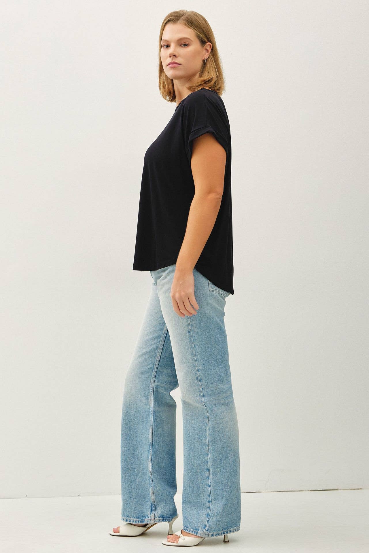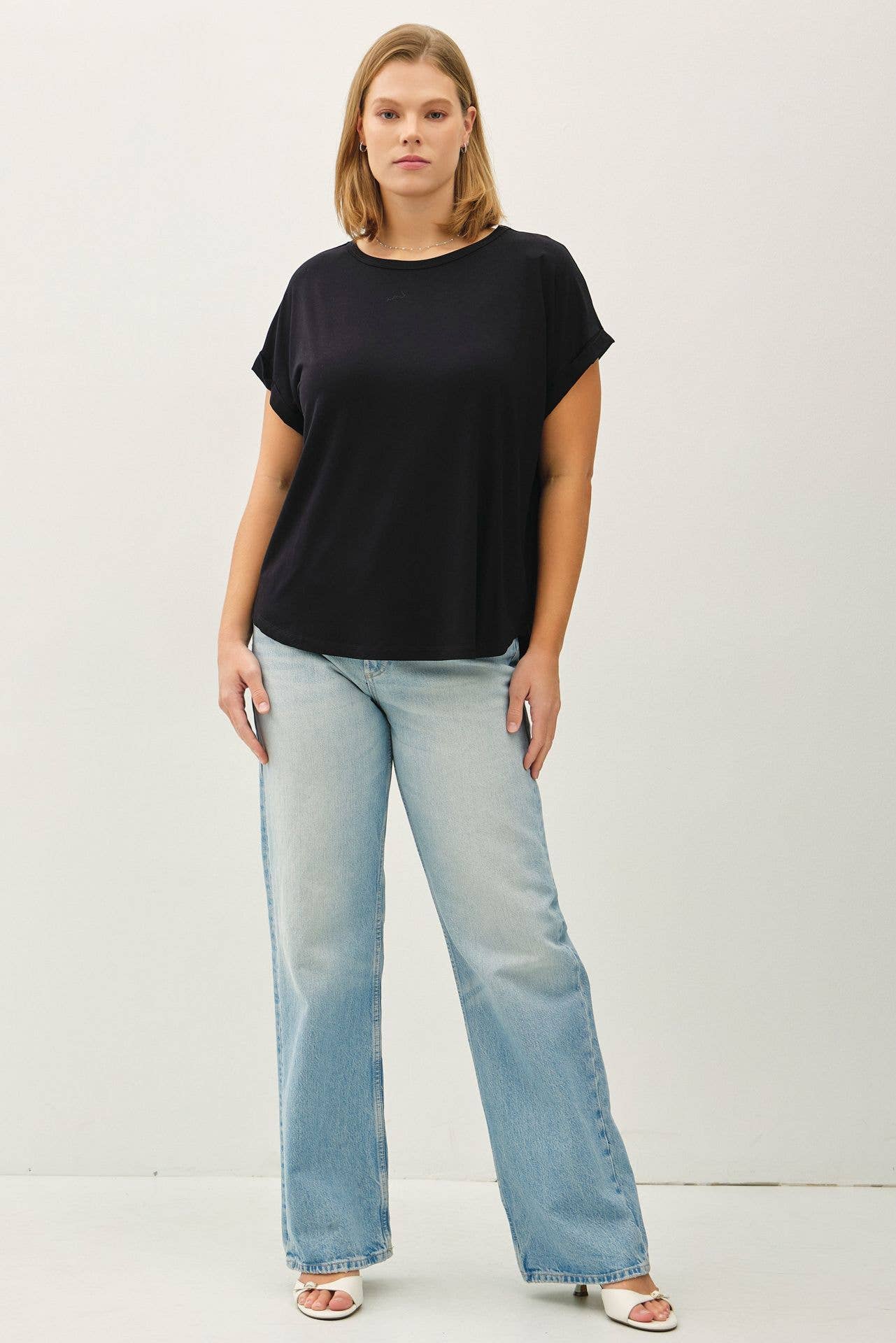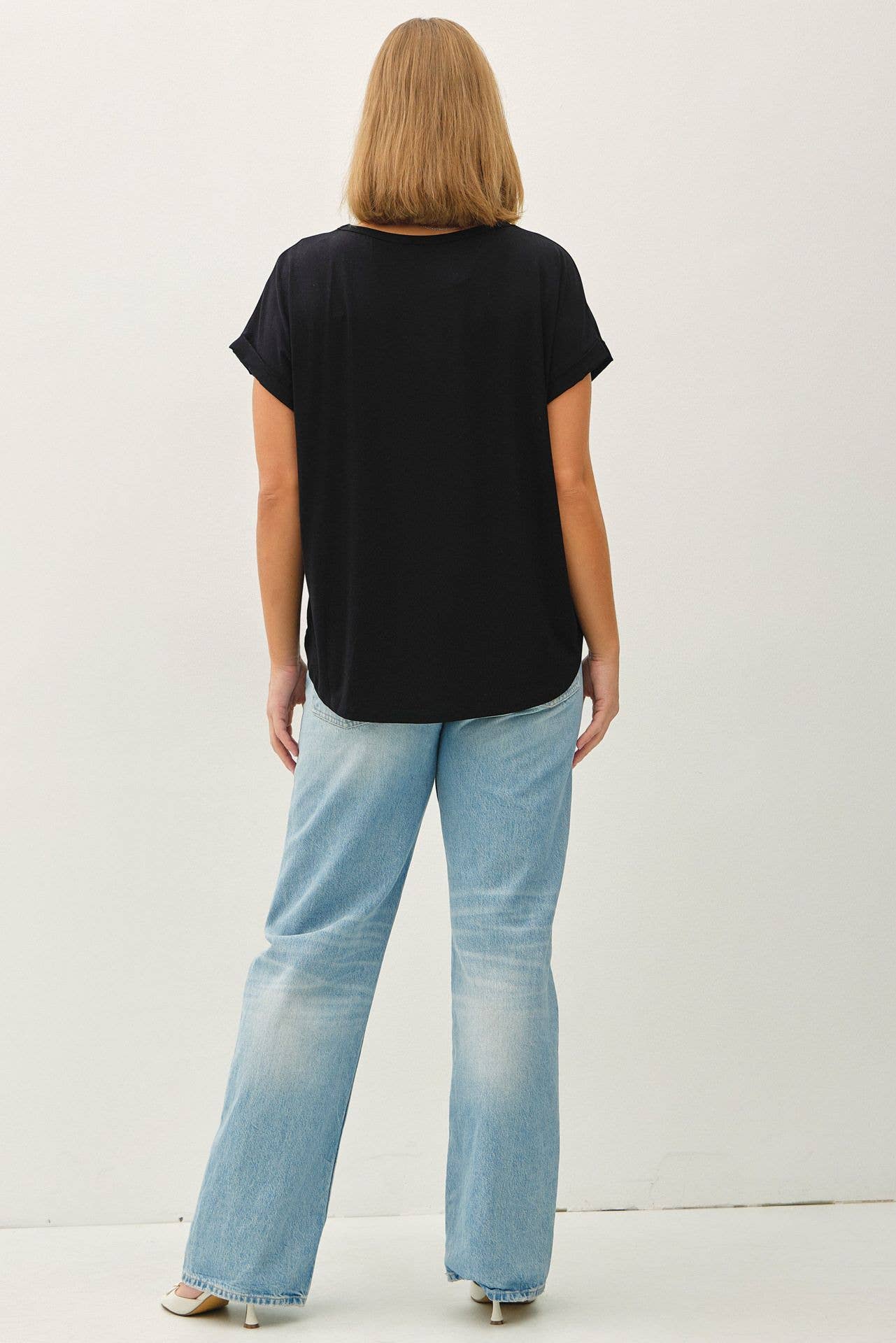 This essential Lover Girl black T-shirt features a round neckline, dolman and cap sleeves with a stylish rolled-up detail. Its round, high-low hem adds a modern touch. Made from soft bamboo and modal fibers, it feels cool against the skin and offers a relaxed fit in regular sizing for comfortable everyday wear.
