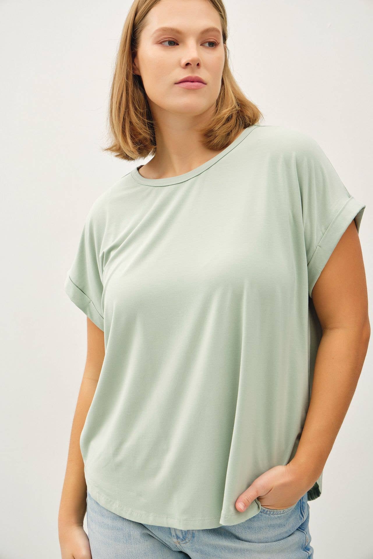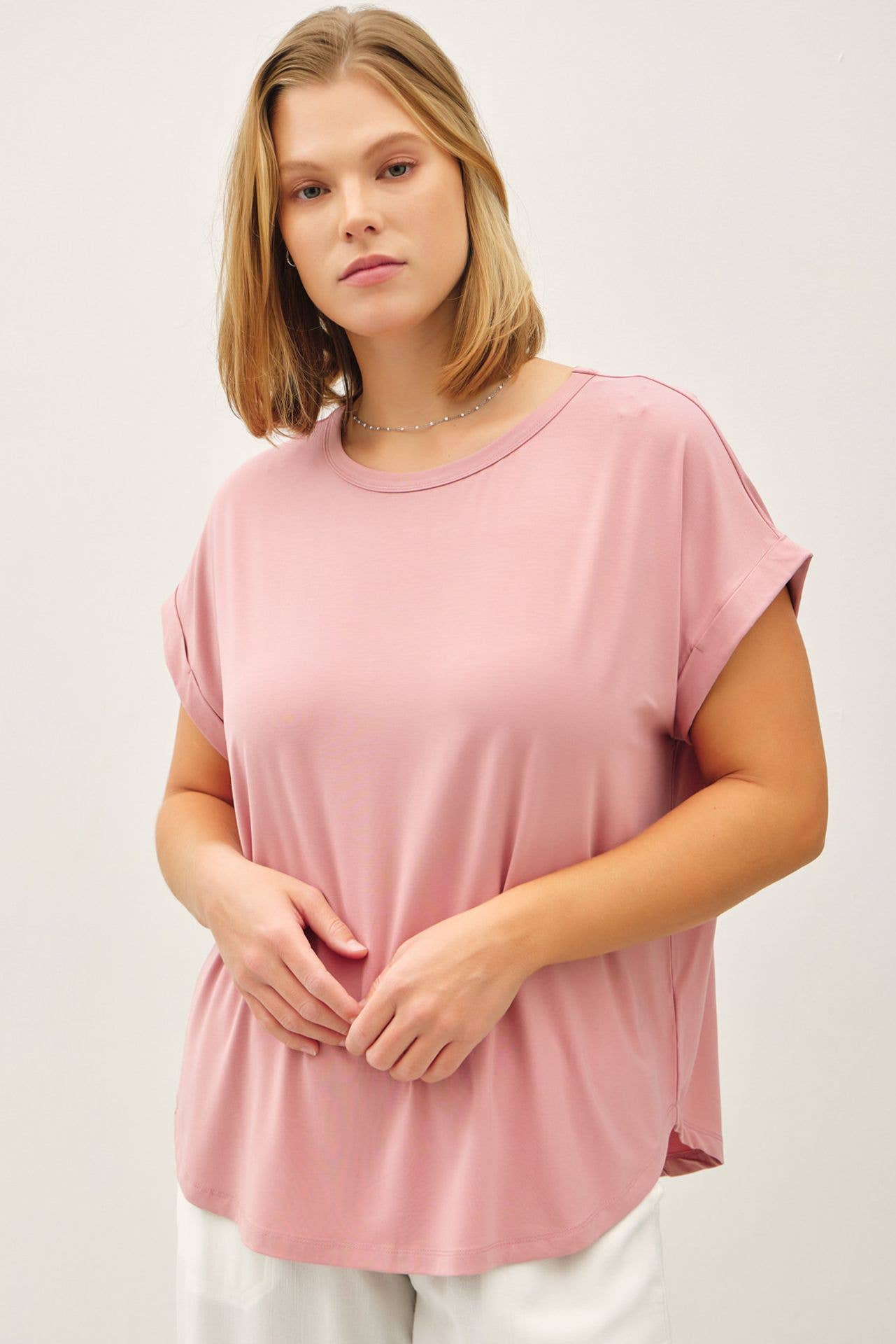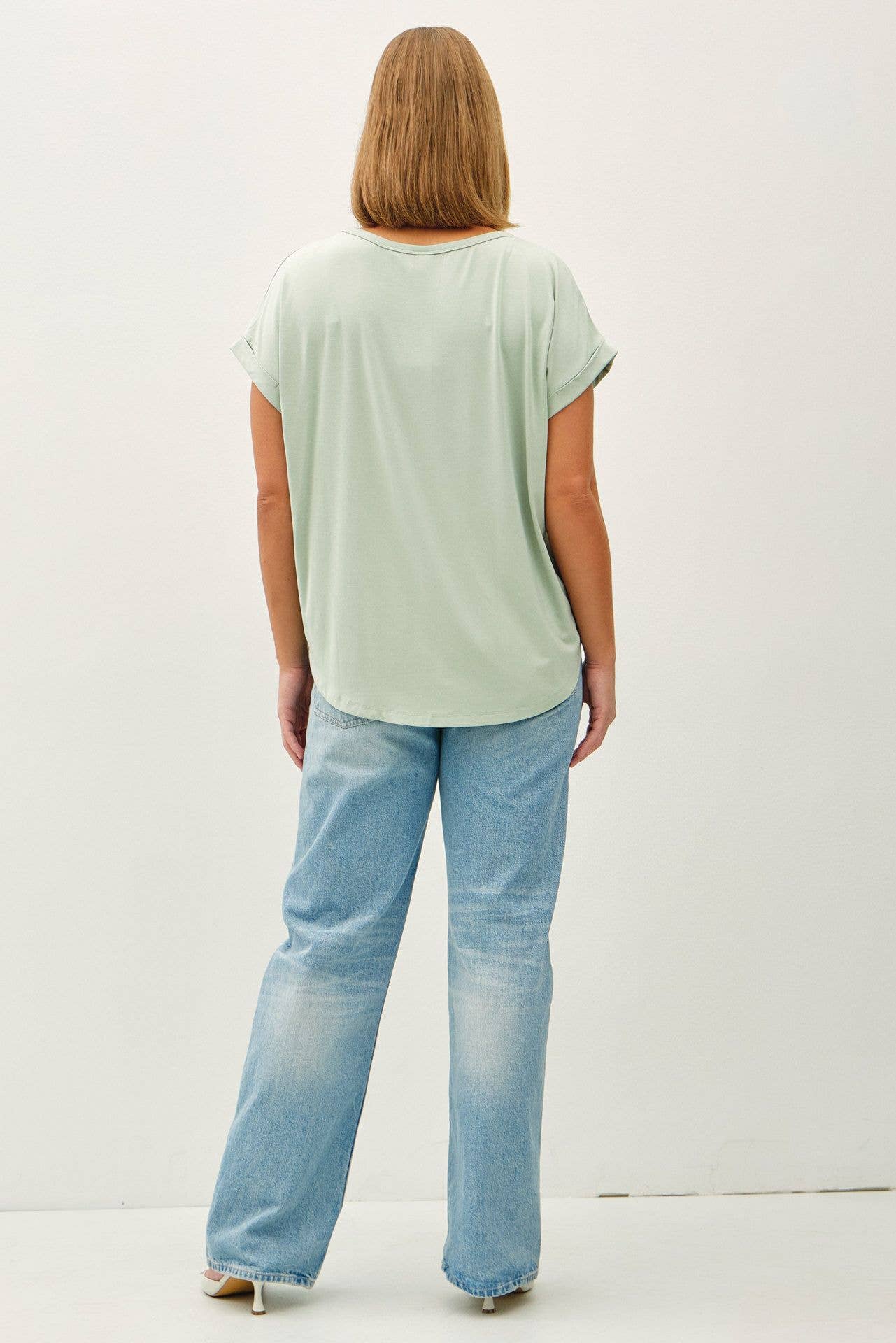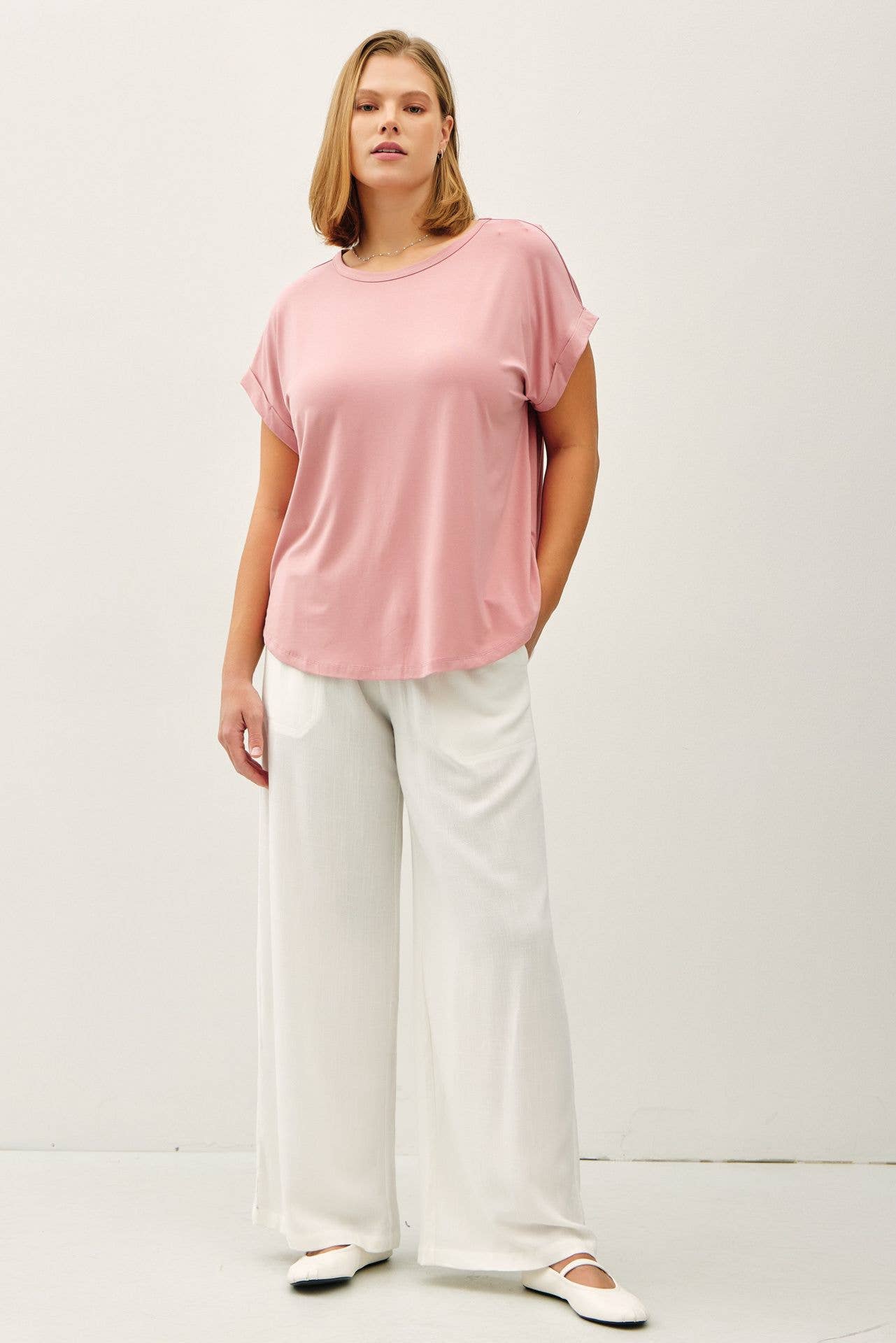 This essential Lover Girl black T-shirt features a round neckline, dolman and cap sleeves with a stylish rolled-up detail. Its round, high-low hem adds a modern touch. Made from soft bamboo and modal fibers, it feels cool against the skin and offers a relaxed fit in regular sizing for comfortable everyday wear.