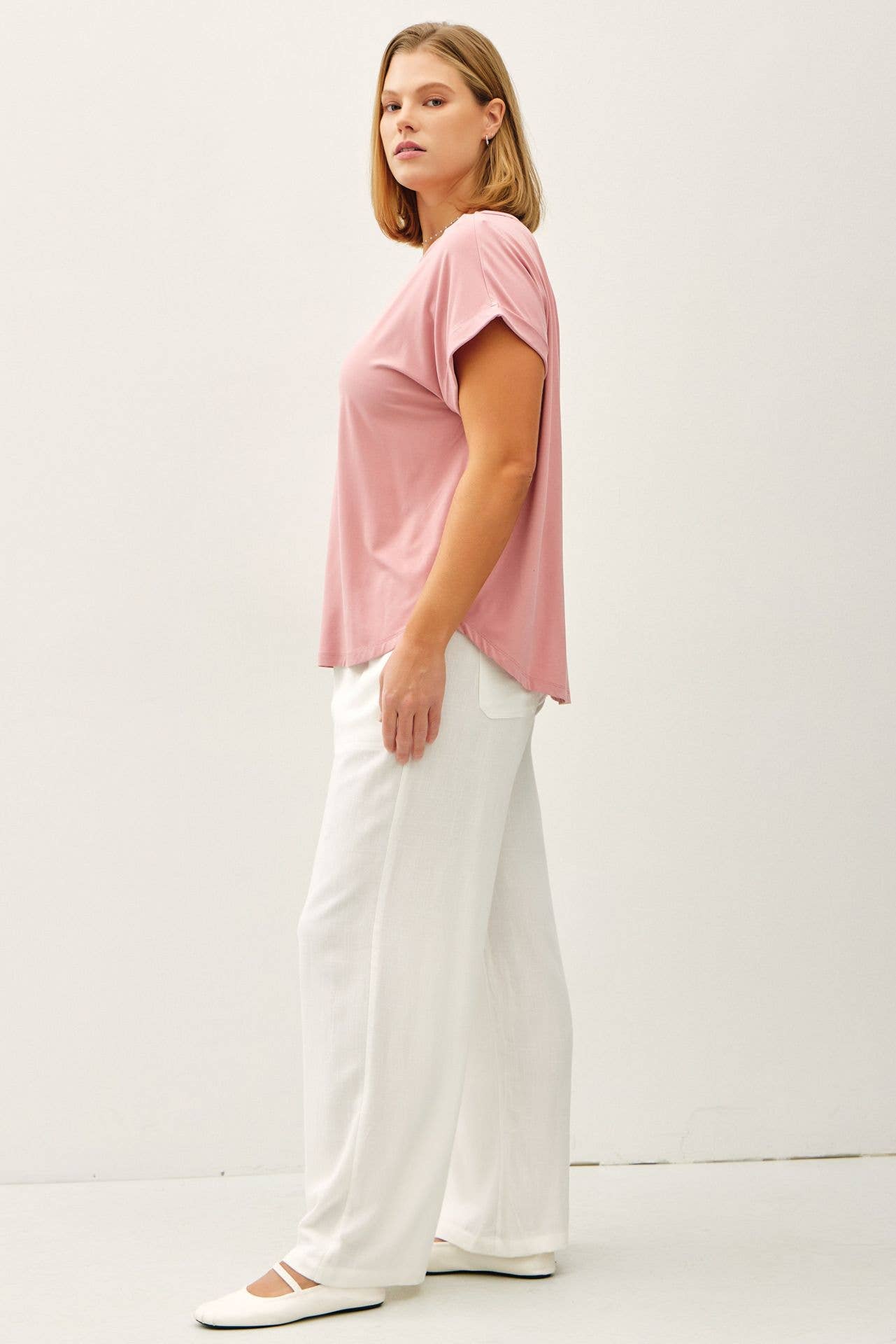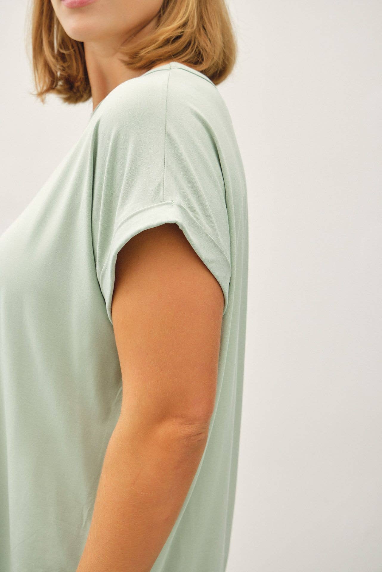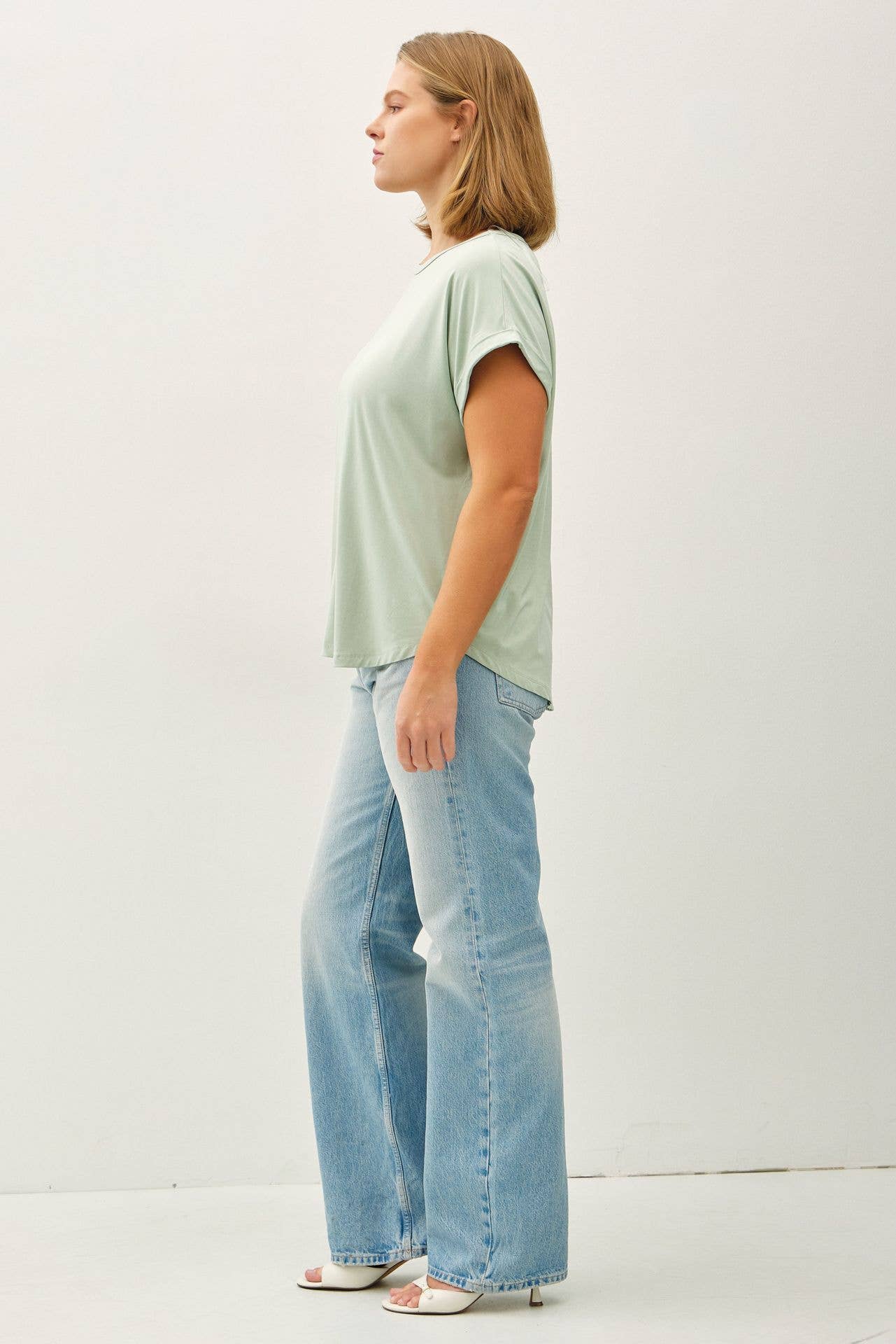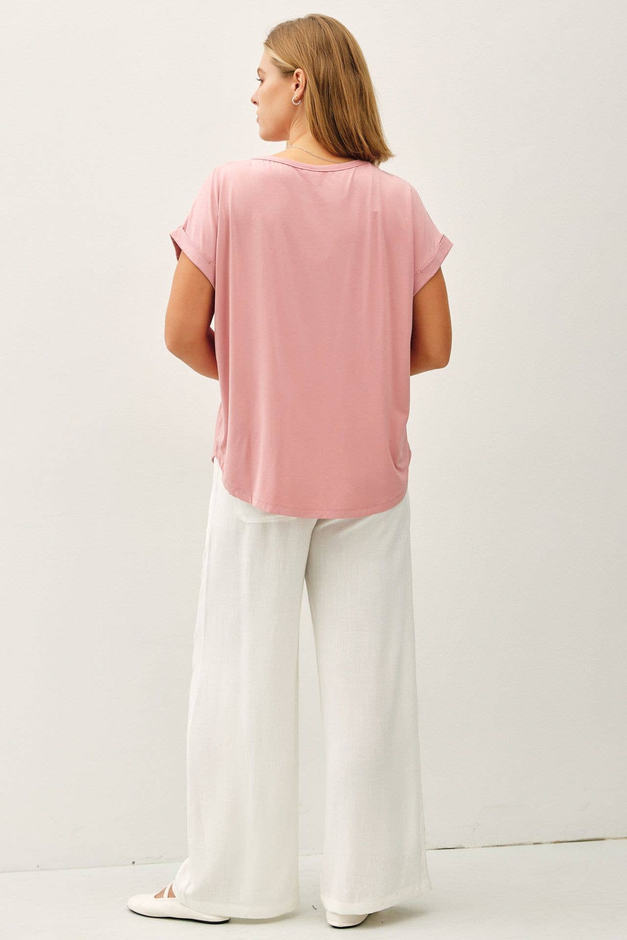 This essential Lover Girl black T-shirt features a round neckline, dolman and cap sleeves with a stylish rolled-up detail. Its round, high-low hem adds a modern touch. Made from soft bamboo and modal fibers, it feels cool against the skin and offers a relaxed fit in regular sizing for comfortable everyday wear.