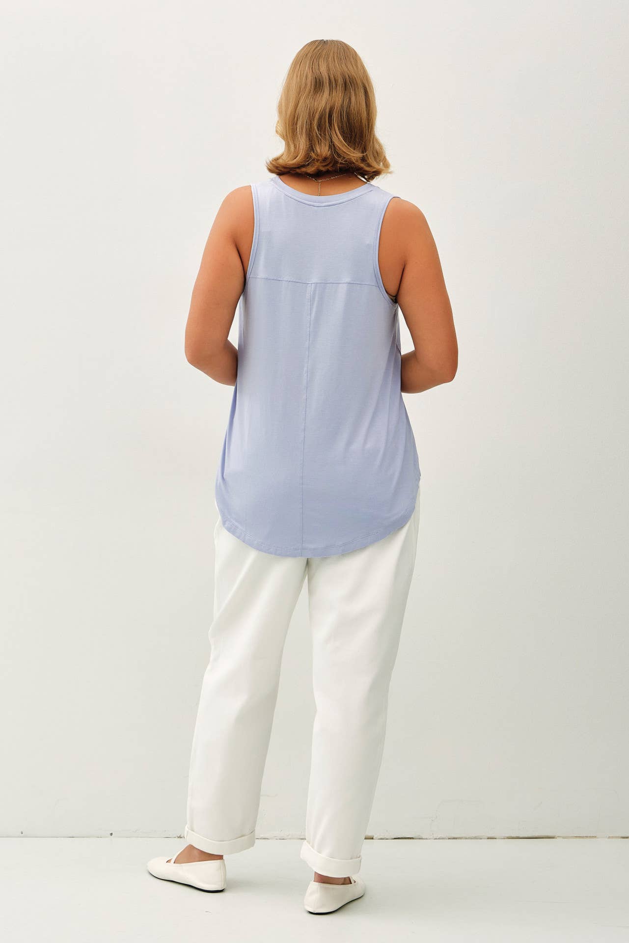 Made to flatter your curves, this soft knit dusty blue tank features a breezy V-neckline and a flowy high-low hem that drapes beautifully below the hips. With thoughtful details like a back yoke and center seam, it’s lightweight, comfy, and perfect for effortless summer style.