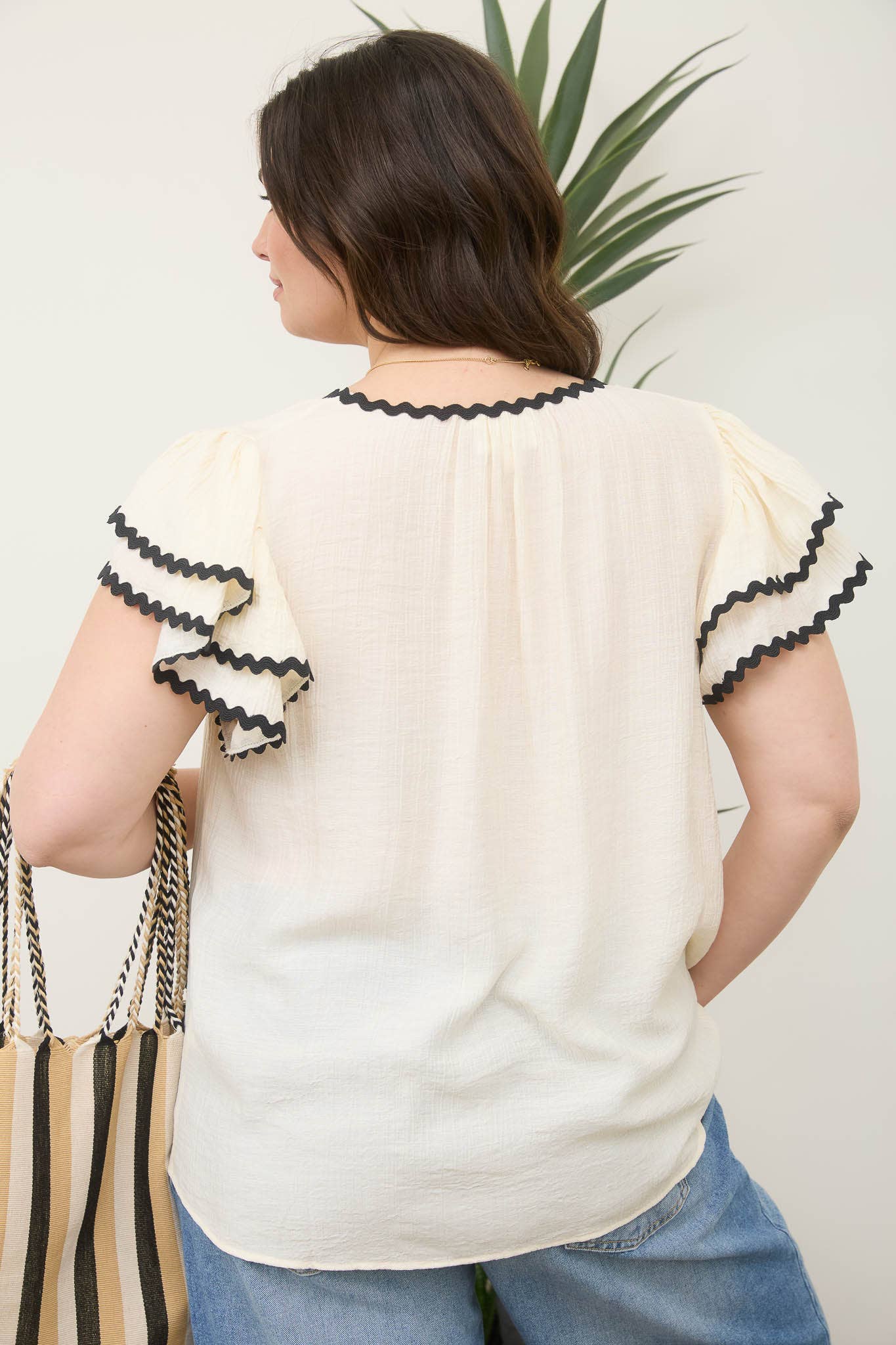 This cream woven top features a V neckline and short ruffle sleeves with layered detailing. It highlights a wavy trim and contrasting edges, crafted from solid fabric without lining for a comfortable fit.