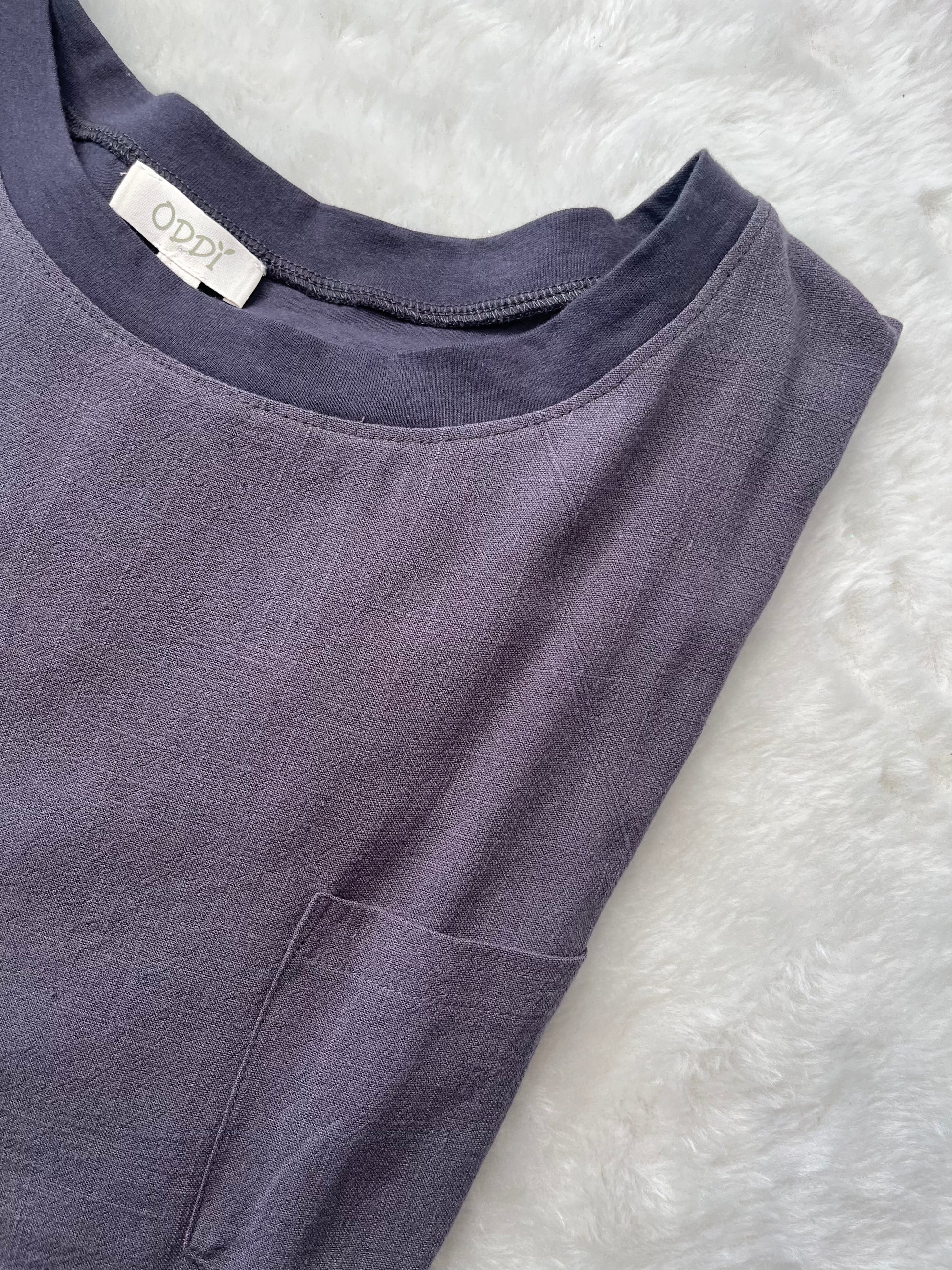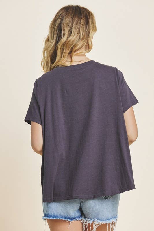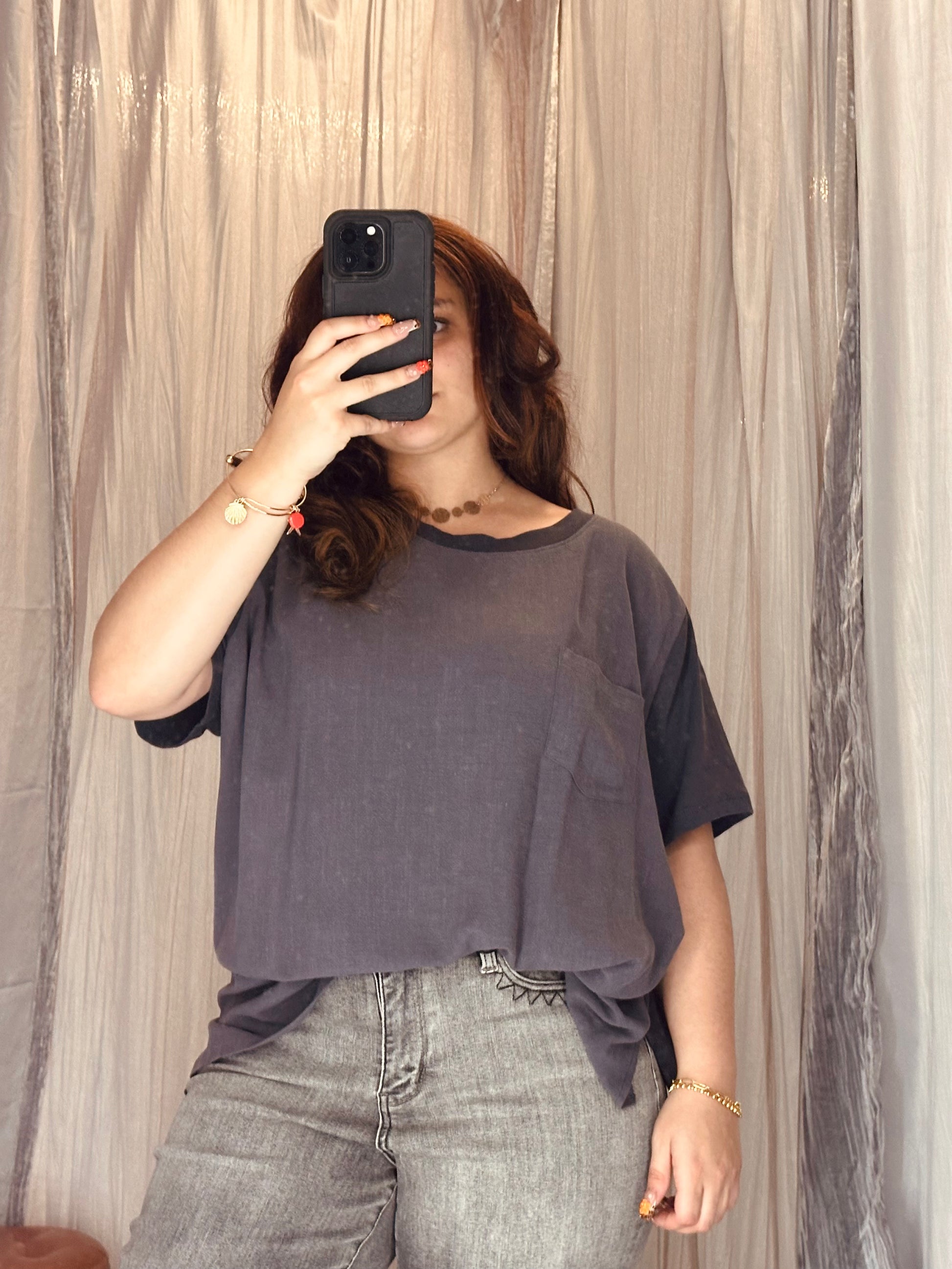 Experience comfort and style with this charcoal washed cotton t-shirt, designed with a flattering round neck, convenient front pockets, and short sleeves—perfectly tailored for curvy figures.