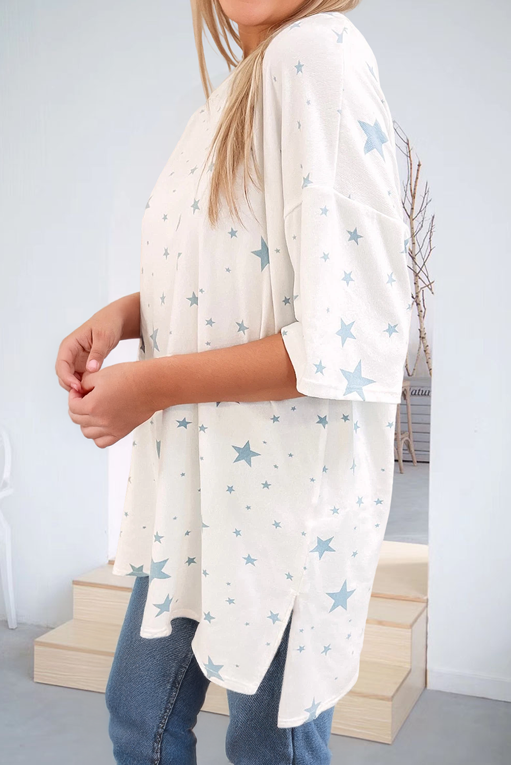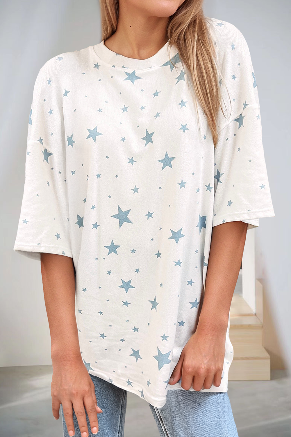 This this white with blue stars T-Shirt is your go-to for effortless summer style. Its oversized fit pairs perfectly with leggings, jeans, or your favorite beachwear, making it easy to dress up or down. Crafted from super soft fabric, it’s so comfy you’ll want to wear it every day.
