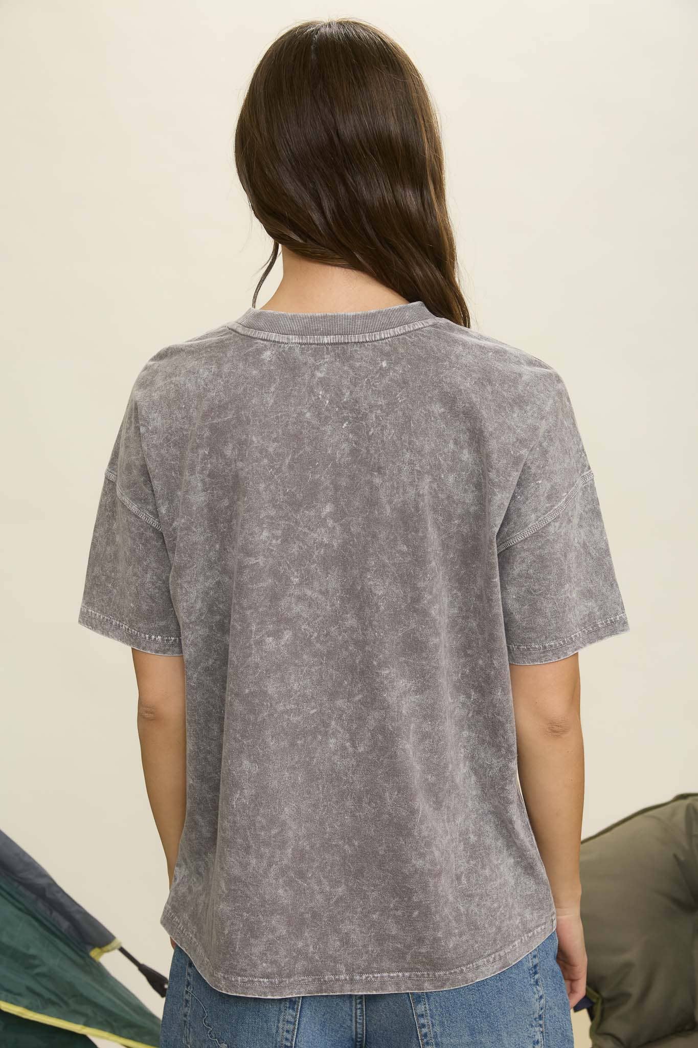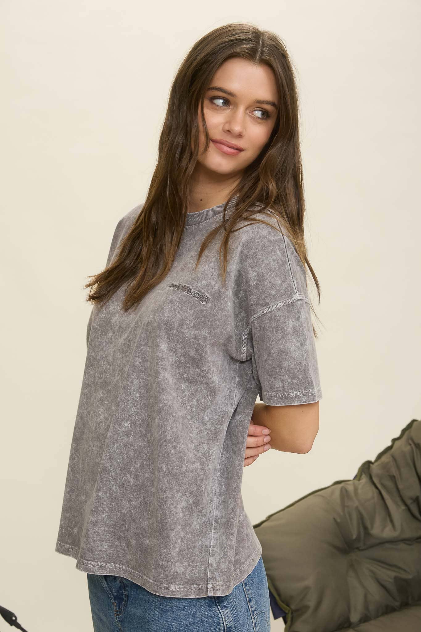 This knit top features a round neckline, short sleeves, and a relaxed fit with drop shoulders. It showcases embroidered "Good Vibes" text alongside a smiley face, all set on a washed pattern. The top is unlined for comfortable wear.
