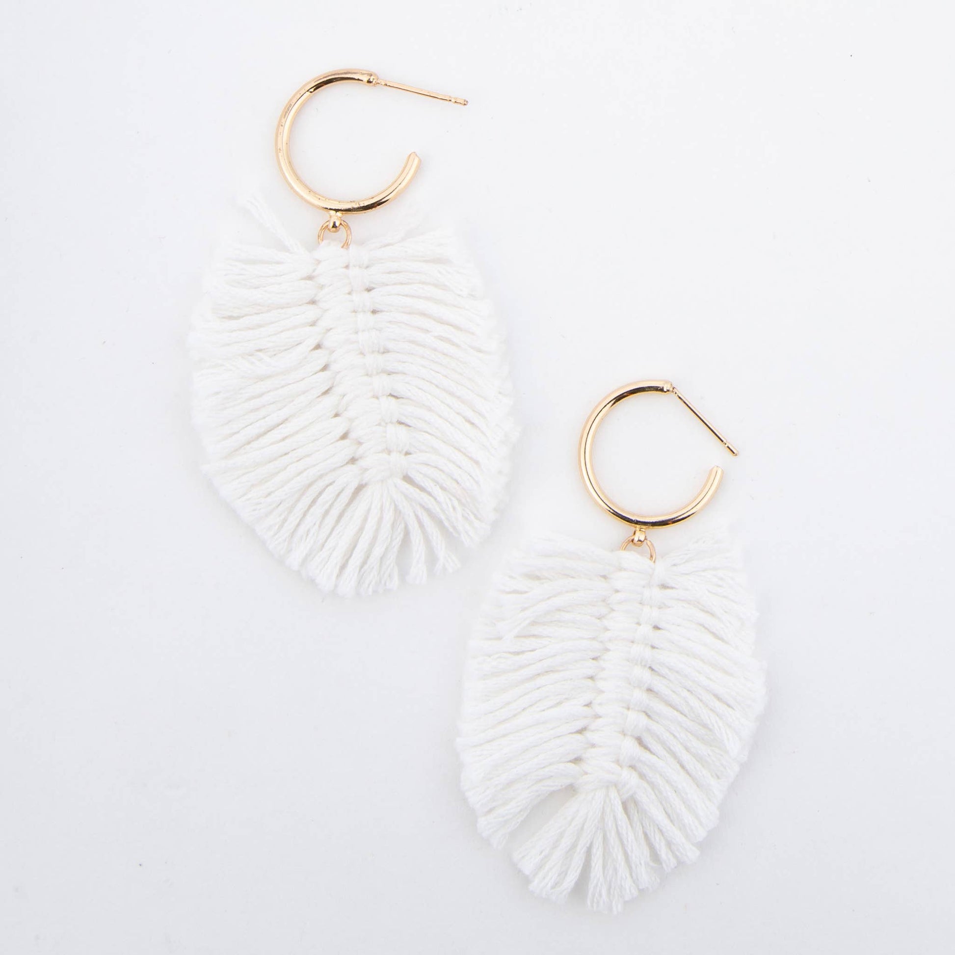 Bold and playful, the Zephyr Fringe Macrame Palm Earrings feature a stunning palm leaf design made entirely in macrame. Dangling off a classic C Hoop, these earrings are easy to wear and sure to turn heads.